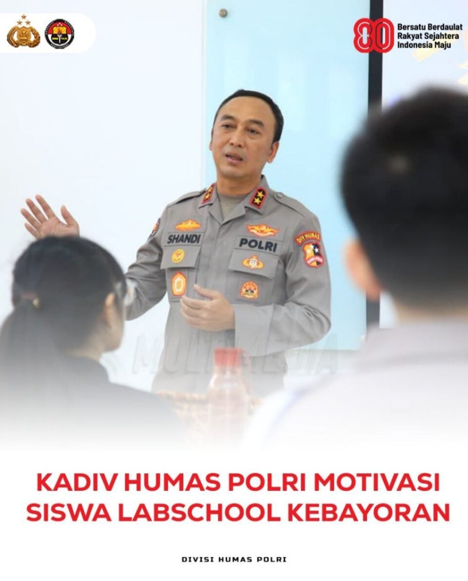 Kepala Divisi Humas Polri, Irjen Pol. Dr. Sandi Nugroho, S.I.K., S.H., M.Hum., hadir sebagai narasumber dalam kegiatan tahunan *Parents Day* di SMP Labschool Kebayoran, Jakarta, pada Jumat (19/9). Acara ini menghadirkan 15 narasumber dari berbagai profesi, sebagian besar merupakan orang tua murid, yang bertujuan memperluas wawasan siswa, memberikan motivasi, serta menanamkan nilai positif bagi masa depan mereka.