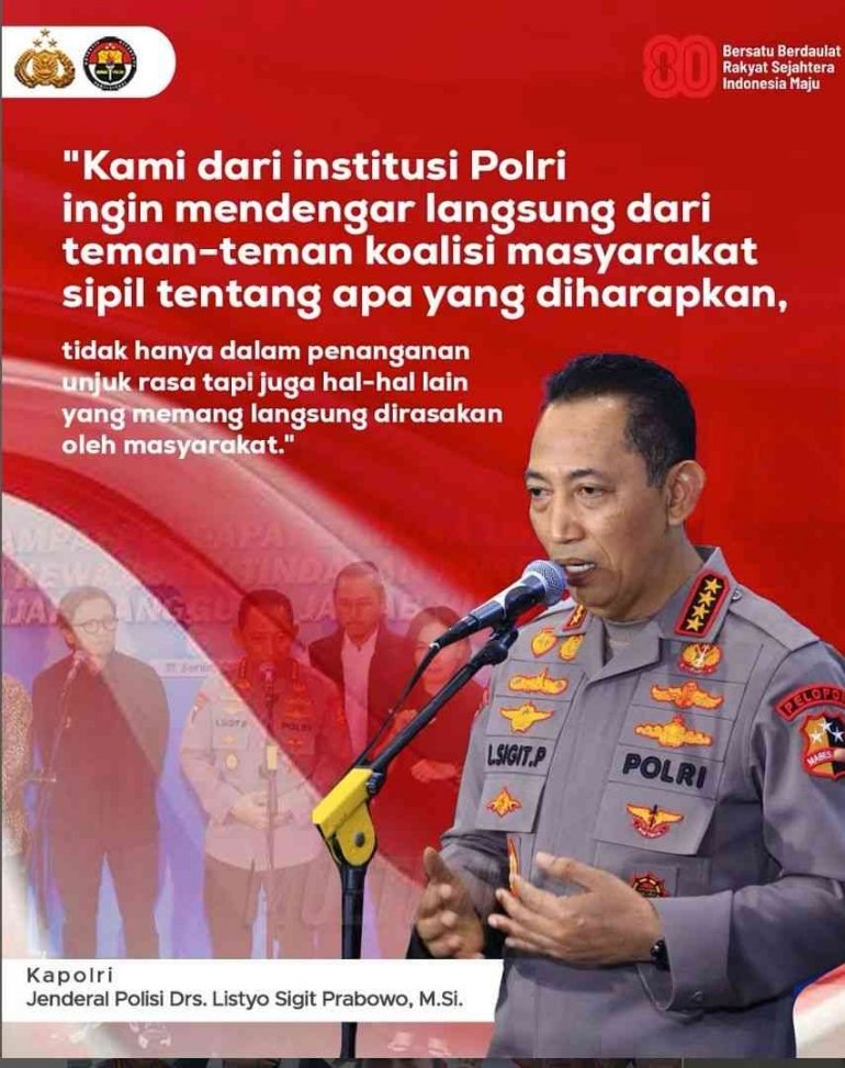 Jakarta — Kapolri Jenderal Polisi Drs. Listyo Sigit Prabowo, M.Si., menegaskan bahwa Polri terus membuka ruang dialog publik sebagai wadah untuk mendengar langsung aspirasi masyarakat. Menurutnya, suara publik merupakan bagian penting dalam mewujudkan penegakan hukum yang profesional, akuntabel, dan berlandaskan pada prinsip hak asasi manusia.